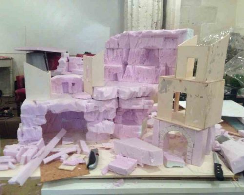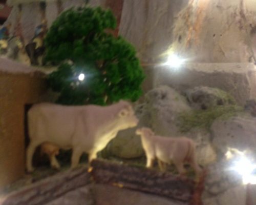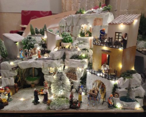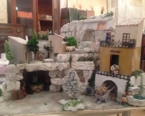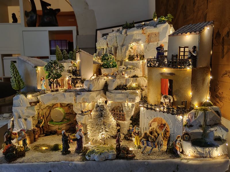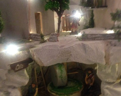 A Presepe with a very Modican feel. The grottas of Modica were filled with olive oil presses, animals and the house on the right is a Modica chocolate factory. The beans arrive at the dammuso on the ground floor, the man on the first floor rolls the cocoa into a butter from which the chocolate is made. Once put in the forms, the woman on the 2nd floor bangs the trays to get the air bubbles out.